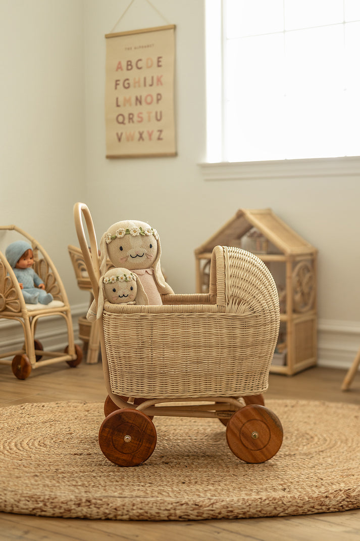 Masterfully handcrafted from the finest rattan, the body of the pram exudes a timeless charm. The delicate patterns of the weave, combined with the pram's classic silhouette, make it a captivating play accessory that sparks creativity and pretend play.
