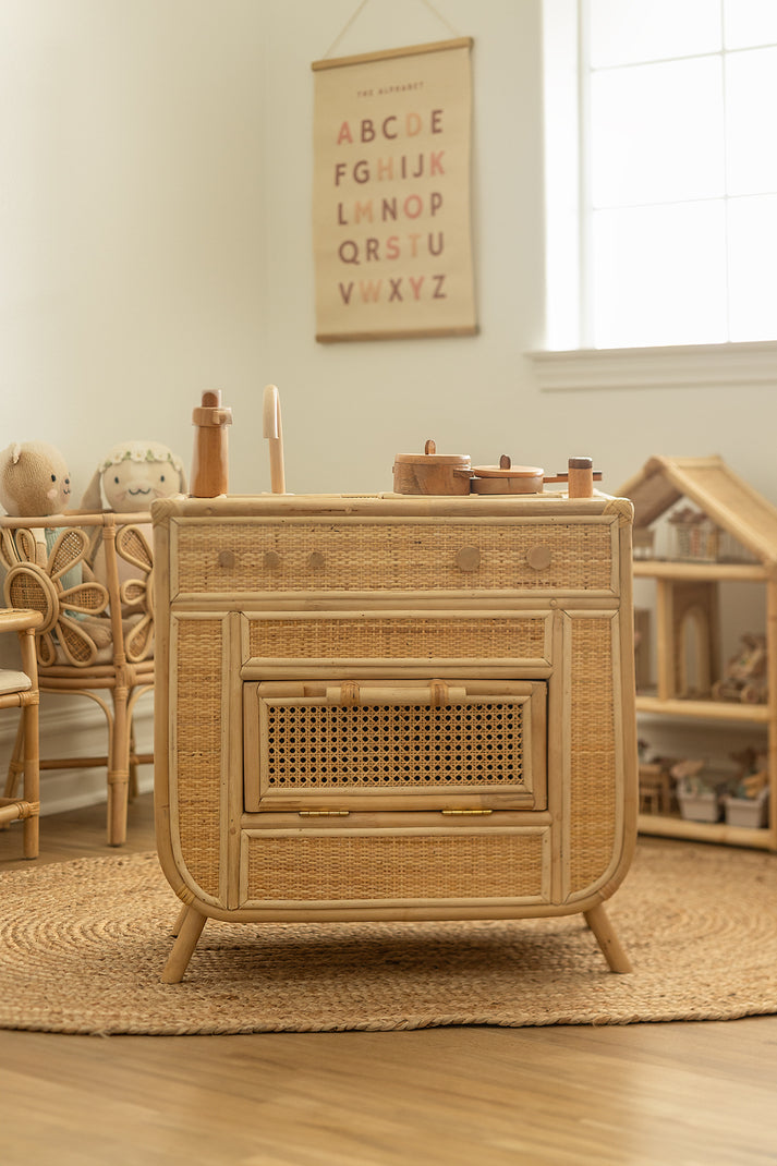 Whisk into a world of culinary fantasy with the Whimsical Wonders Rattan Kitchenette. Crafted with budding chefs in mind, this unique playset offers a realm where imagination stirs, and culinary tales come to life. Exemplifying artisan craftsmanship, this kitchenette is meticulously handwoven from premium rattan. The inherent beauty of the rattan, with its intricate patterns and natural hues, infuses an aura of rustic charm, ensuring it stands as a timeless centerpiece in any play area.
