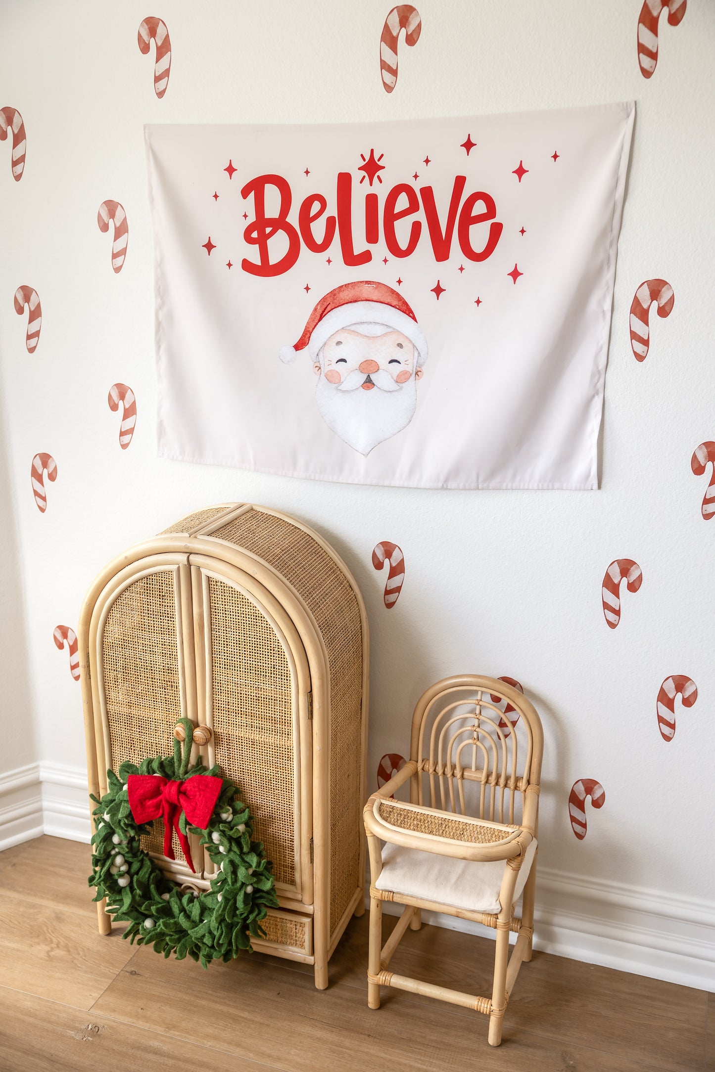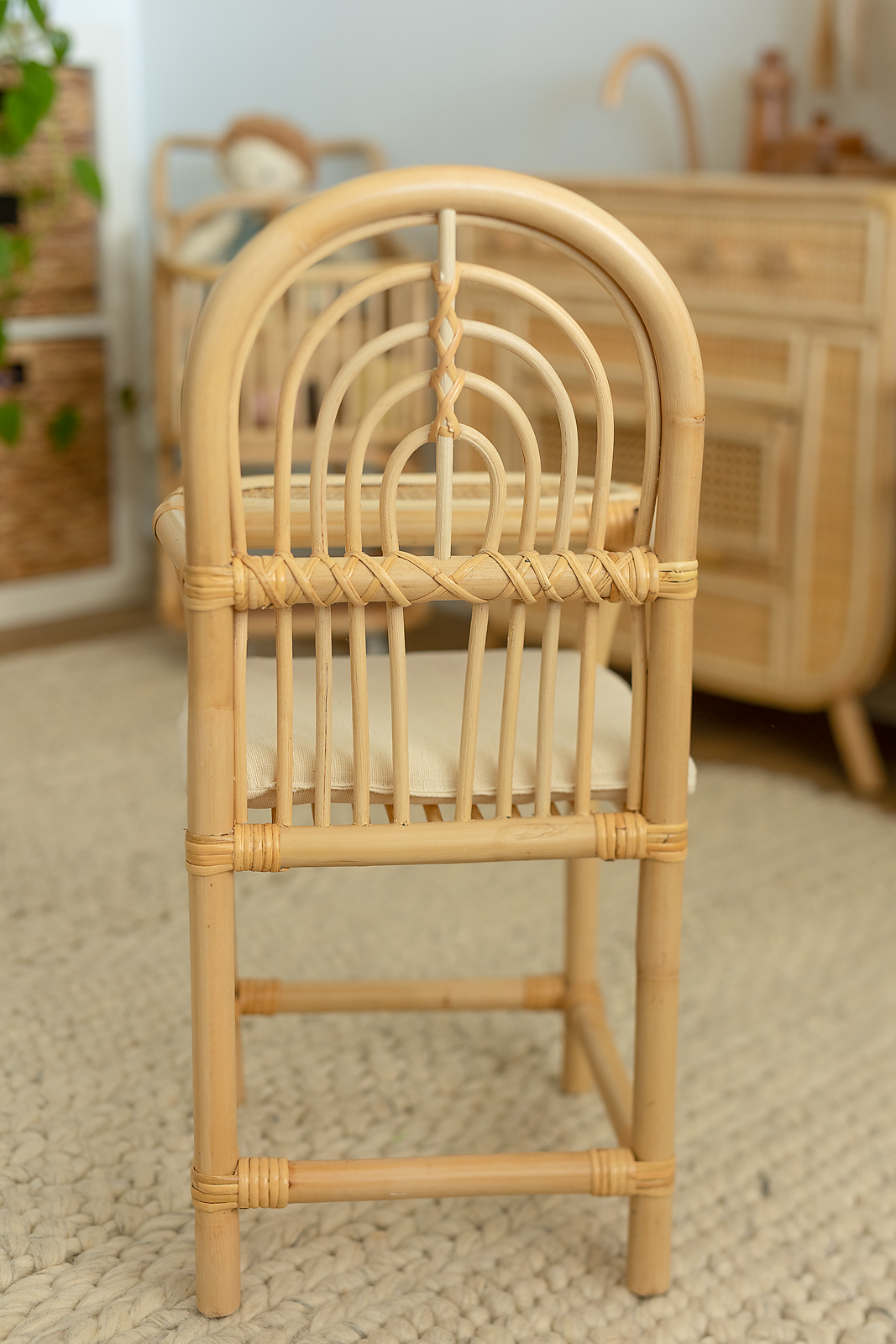 The high chair is masterfully handcrafted from durable and eco-friendly rattan, designed to withstand years of imaginative play. The chair features comes with a comfortable padded seat, ensuring that your child's beloved doll sits comfortably during pretend meal times. The soft padding is covered with a child-friendly fabric that is both durable and easy to clean. The intricate rattan weaving adds a touch of natural elegance to the piece, making it a delightful addition to any play area or child's room.