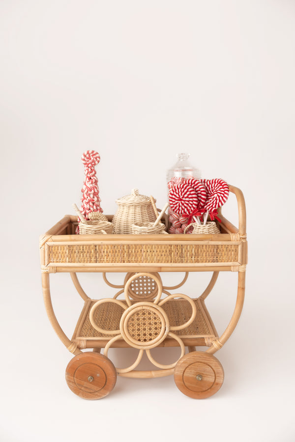 Introducing the Woven Wonder Tea Cart a whimsical addition to any child's playtime collection. Beautifully handcrafted from durable and environmentally-friendly rattan and bamboo, this tea cart is a miniature masterpiece that's as sturdy as it is stylish.