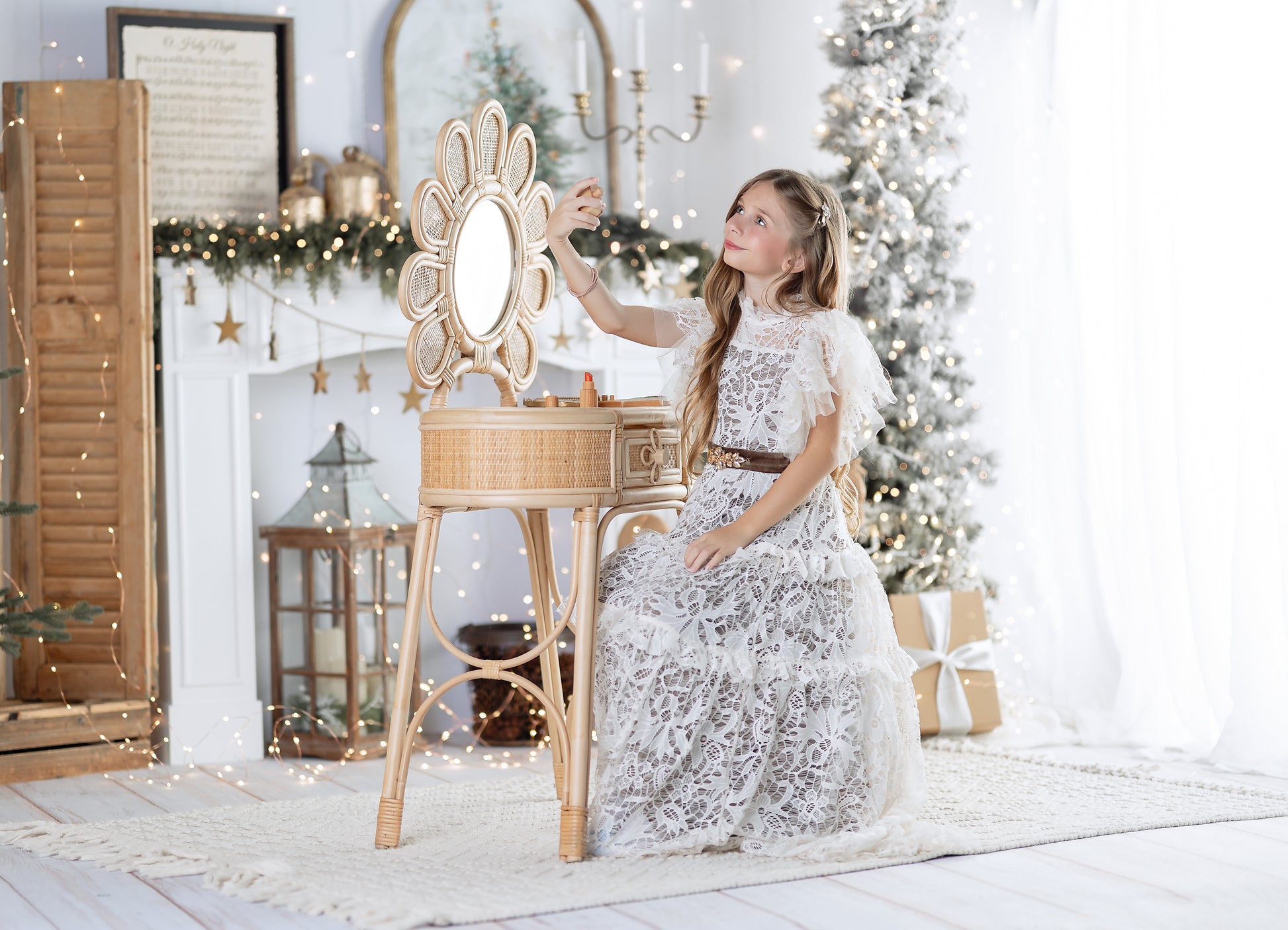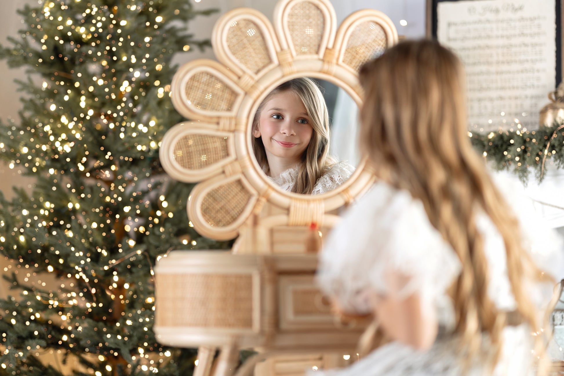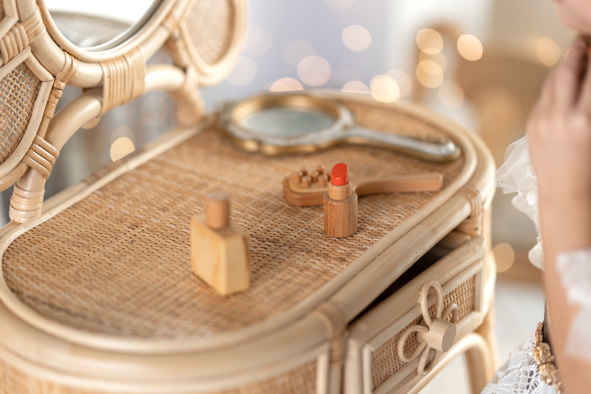 Expertly handcrafted from sustainable and durable rattan, this vanity features a tabletop surface perfect for arranging accessories, a mirror for your child to admire their outfits, and a comfortable stool for sitting.