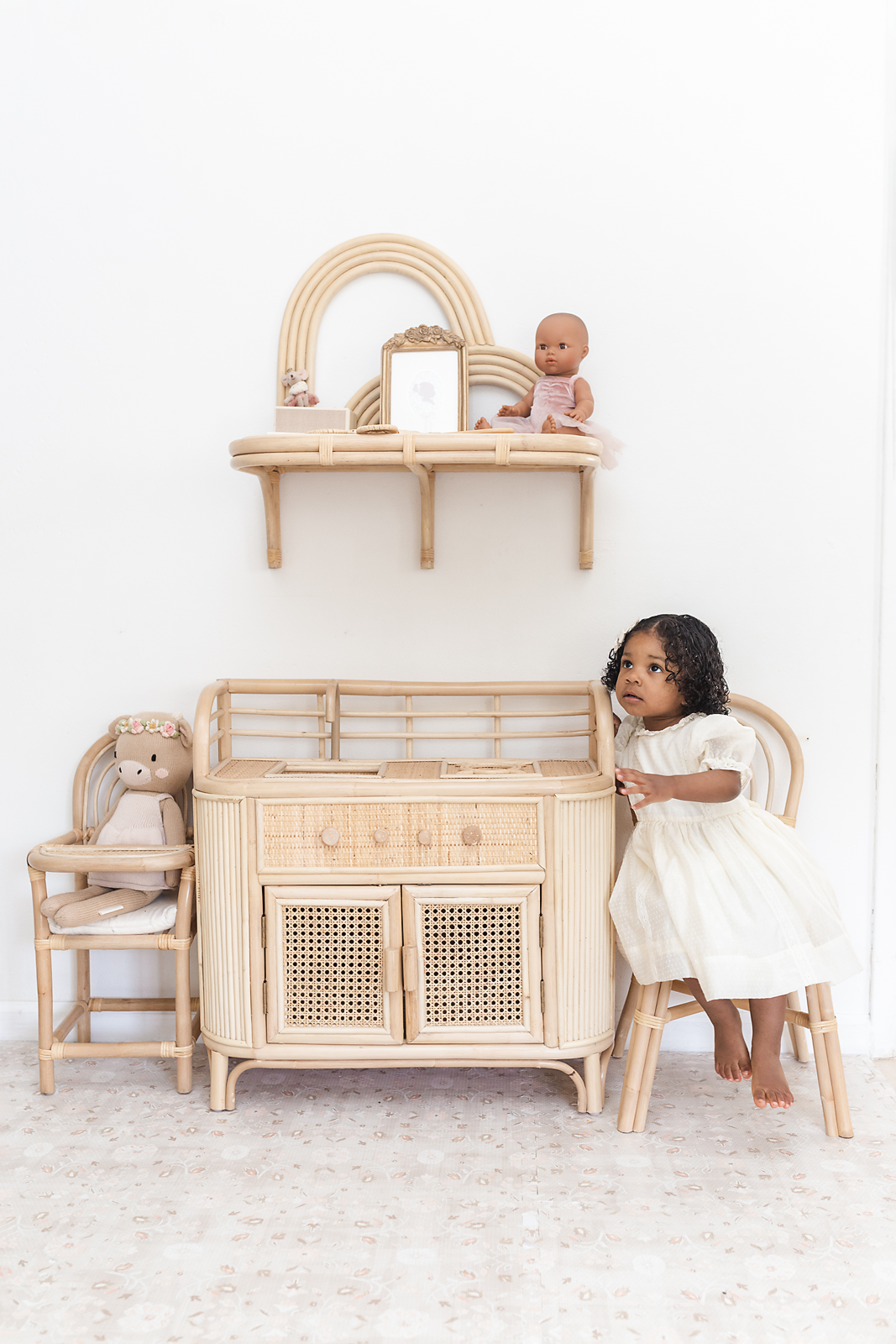 The kitchenette features a spacious countertop for prepping 'meals,' and a storage area underneath to keep pots, pans, and play food. A cabinet with rattan-webbed doors provides a lovely aesthetic while offering space for kitchen essentials. Four charming knobs adorn the front, simulating a realistic kitchen environment that encourages interactive play. Constructed from high-quality rattan, the Gourmet Grove Kitchenette is not only sturdy and durable but also brings a touch of natural elegance to any play area.