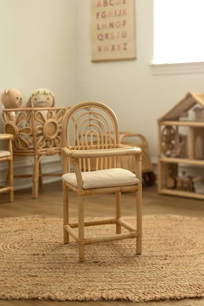 The high chair is masterfully handcrafted from durable and eco-friendly rattan, designed to withstand years of imaginative play. The chair features comes with a comfortable padded seat, ensuring that your child's beloved doll sits comfortably during pretend meal times. The soft padding is covered with a child-friendly fabric that is both durable and easy to clean. The intricate rattan weaving adds a touch of natural elegance to the piece, making it a delightful addition to any play area or child's room.